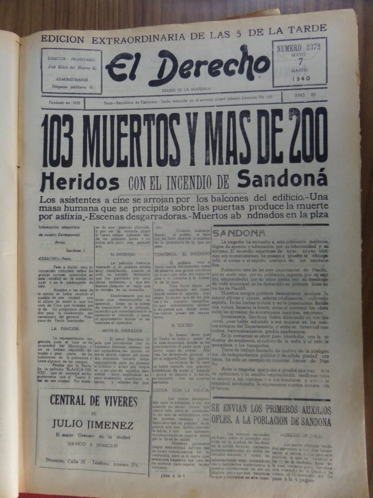 A raíz de este hecho, el Diario El Derecho de Pasto en una edición extraordinaria el martes 7 de mayo publicó en la primera página lo sucedido con el tituló “103 muertos y más de 200 heridos con el incendio de Sandoná” y en el subtítulo o bajada “Los asistentes a cine se arrojan por los balcones.- Una masa humana que se precipita sobre las puertas produce la muerte por asfixia.- Escenas desgarradoras.- Muertos abandonados en la plaza”.
