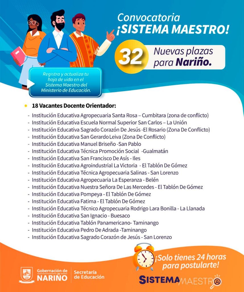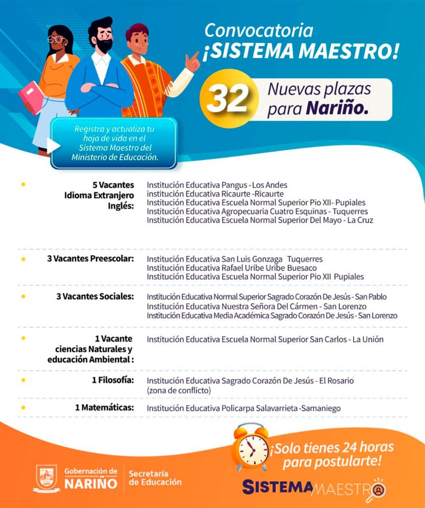 La Secretaría de Educación Departamental anunció la habilitación de 32 nuevas plazas docentes a través del Sistema Maestro del Ministerio de Educación Nacional, con el propósito de fortalecer la cobertura y la calidad educativa en los 61 municipios no certificados del departamento de Nariño.