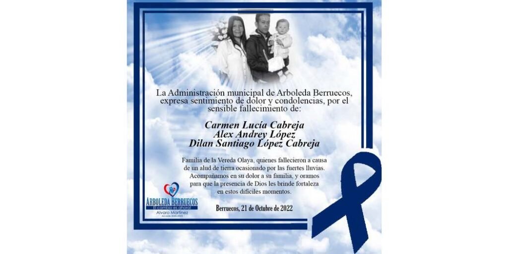La Administración Municipal de Arboleda, orientada por el alcalde Álvaro Evelio Martínez Córdoba, expresó condolencias a los familiares de Andrey López, Carmen Cabreja y su hijo Dilán Santiago, quienes fallecieron este viernes en la madrugada.