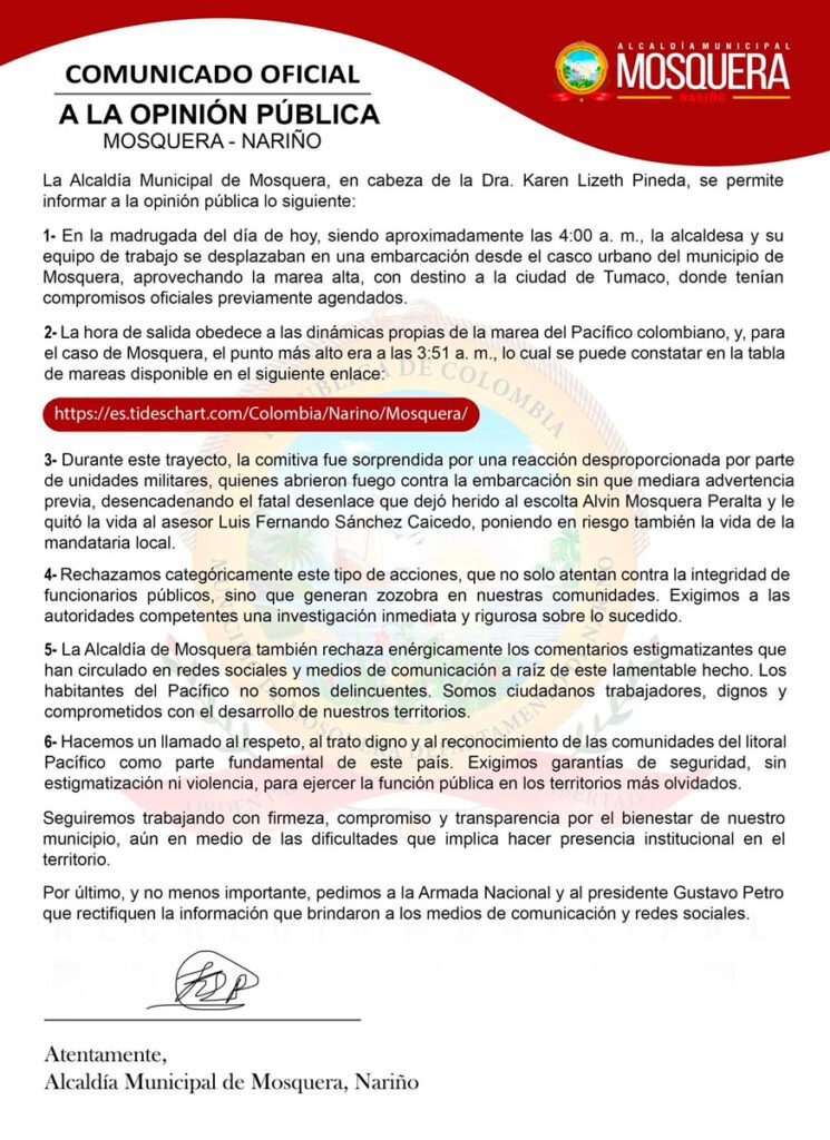 La Alcaldía de Mosquera (Nariño) denunció que en la madrugada del lunes 8 de septiembre de 2025, alrededor de las 4:00 a. m., unidades militares abrieron fuego contra la embarcación en la que se desplazaba la alcaldesa Karen Lizeth Pineda y su equipo hacia Tumaco, “sin advertencia previa”.