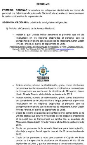 El auto, emitido por la Procuraduría Delegada Disciplinaria de Instrucción para la Fuerza Pública, solicita a la Armada: identificación del personal involucrado y de sus mandos, informe de patrullaje, protocolo vigente de interceptación fluvial, y a la Alcaldía permisos y rutas de la embarcación; además, ordena escuchar en declaración a la alcaldesa y al comandante de la unidad militar correspondiente.