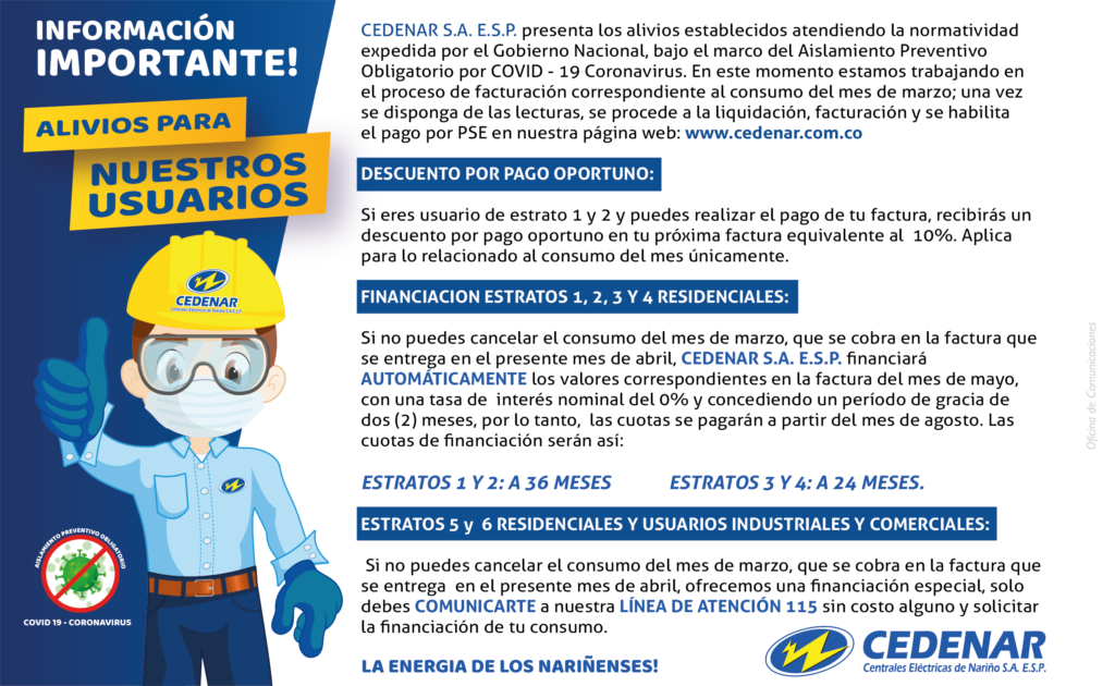 La empresa electrificadora Centrales Eléctricas de Nariño – Cedenar, implementó medidas de alivio en el pago de las facturas de energía eléctrica con base en la normatividad expedida por el Gobierno Nacional, en el marco del aislamiento preventivo obligatorio por el covid-19.