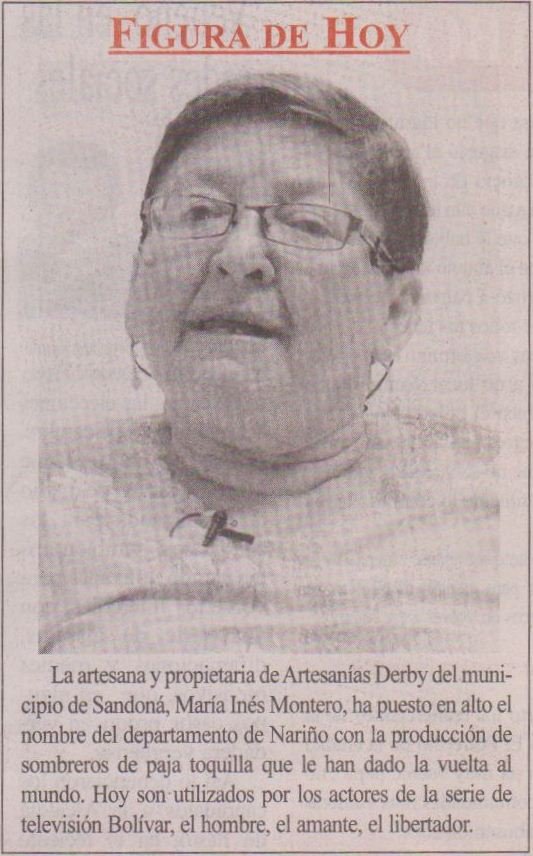 El periódico nariñense manifiesta: “La artesana y propietaria de Artesanías Derby del municipio de Sandoná, María Inés Montero, ha puesto en alto el nombre del departamento de Nariño con la producción de sombreros de paja toquilla que han dado la vuelta al mundo. Hoy son utilizados por los actores de la serie de televisión Bolívar, el hombre, el amante, el libertador.”