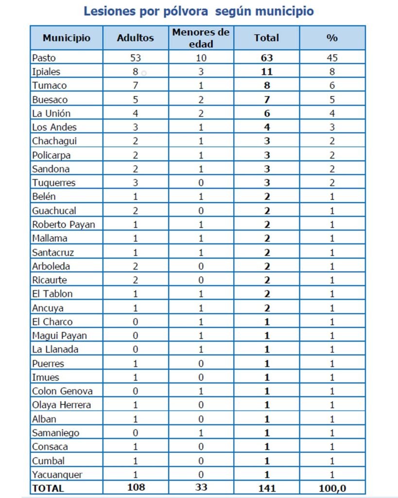 En el departamento de Nariño, el IDSN reportó 27 lesionados con pólvora, para un total acumulado 141 personas, entre ellas tres mujeres. En este grupo están 33 menores de edad.