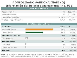 Al final Santos ganó por un buen margen a Mockus. Aquí están los resultados escrutadas las 32 mesas instaladas.