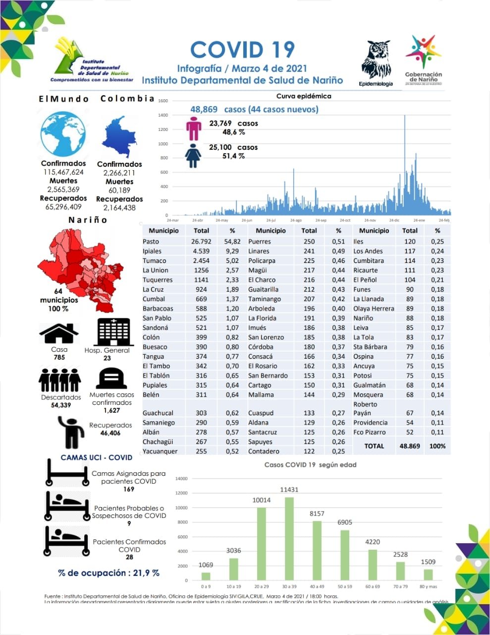 El 4 de marzo de 2021, siendo las 6:00 pm en el Departamento de Nariño se totalizan 48.869 casos positivos para Covid-19. Ocupación de camas UCI en Nariño 21,9%. Se totalizan 1.627 muertes desde el comienzo de la Pandemia en Nariño.