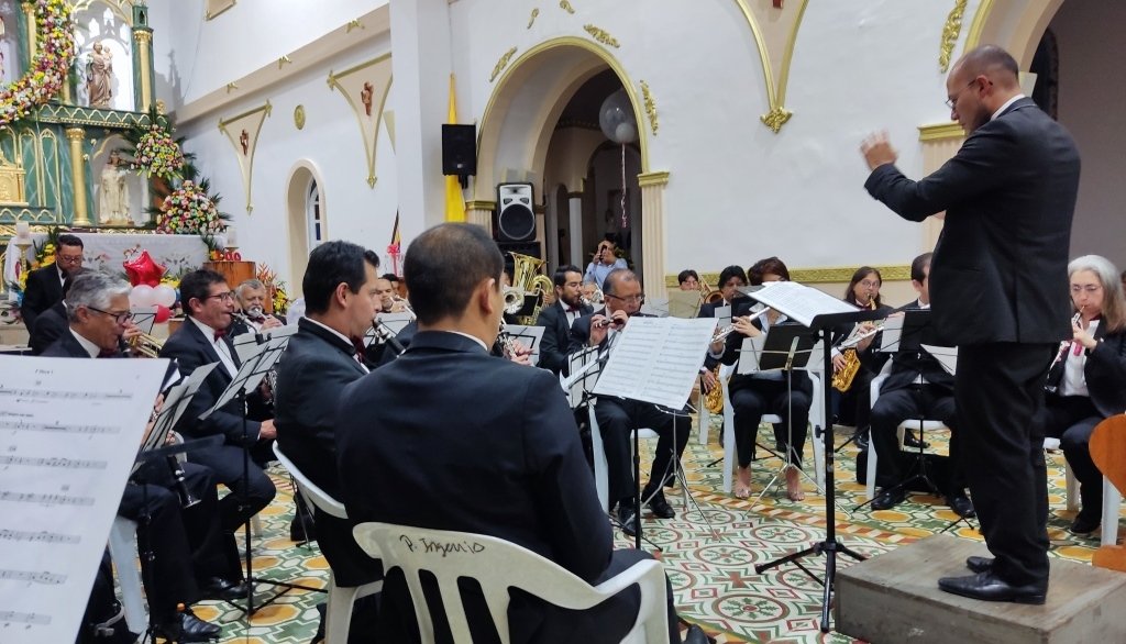 Inicialmente la banda musical se iba a presentar en el parque, ubicado frente al templo, sin embargo por la lluvia fue necesario que se presente en el templo, donde minutos antes los sacerdotes Guido Ortiz e Hibo Hoyos concelebraron la eucaristía.