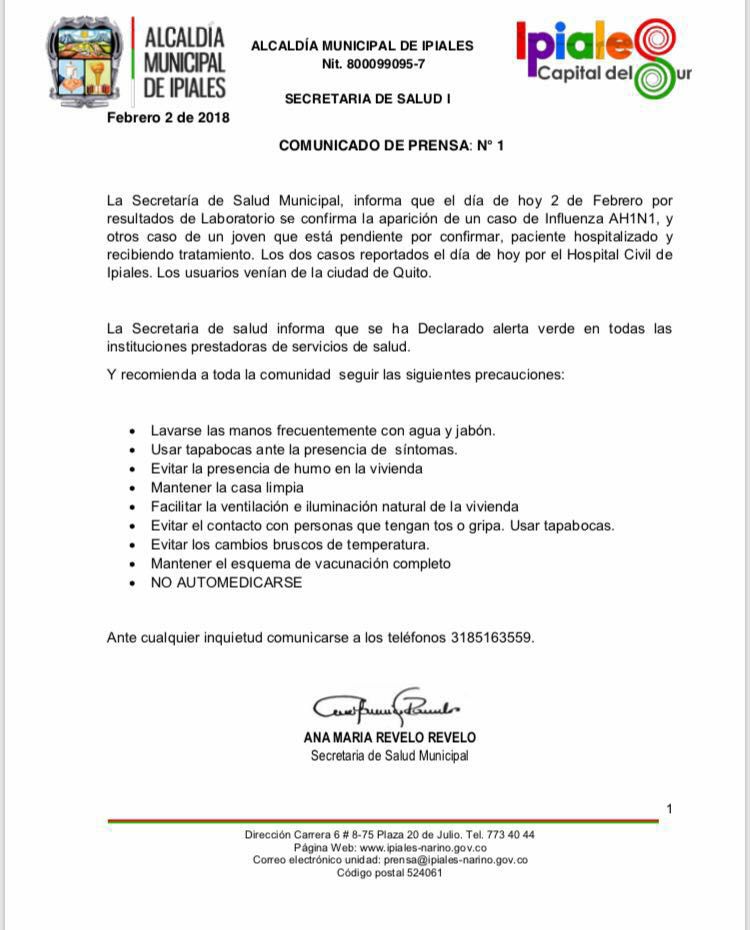 comunicado, emitido el 2 de febrero, Ana María Revelo, secretaria de Salud del