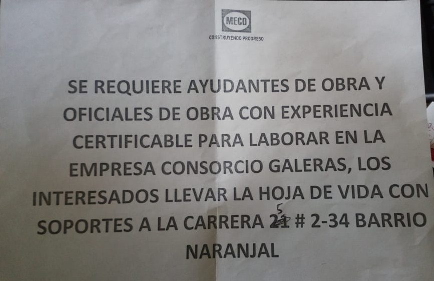 deben llevar la hoja de vida, con sus soportes, a la carrera 5 No. 2-34, barrio