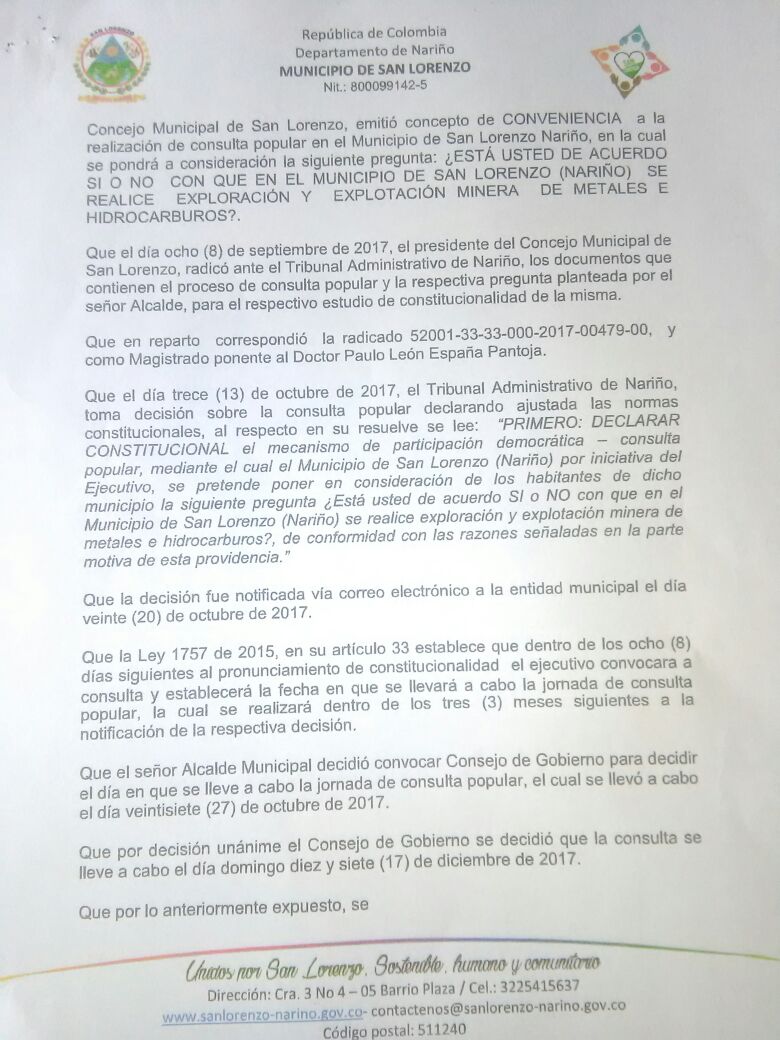 de San Lorenzo, Departamento de Nariño, a CONSULTA POPULAR, para que en