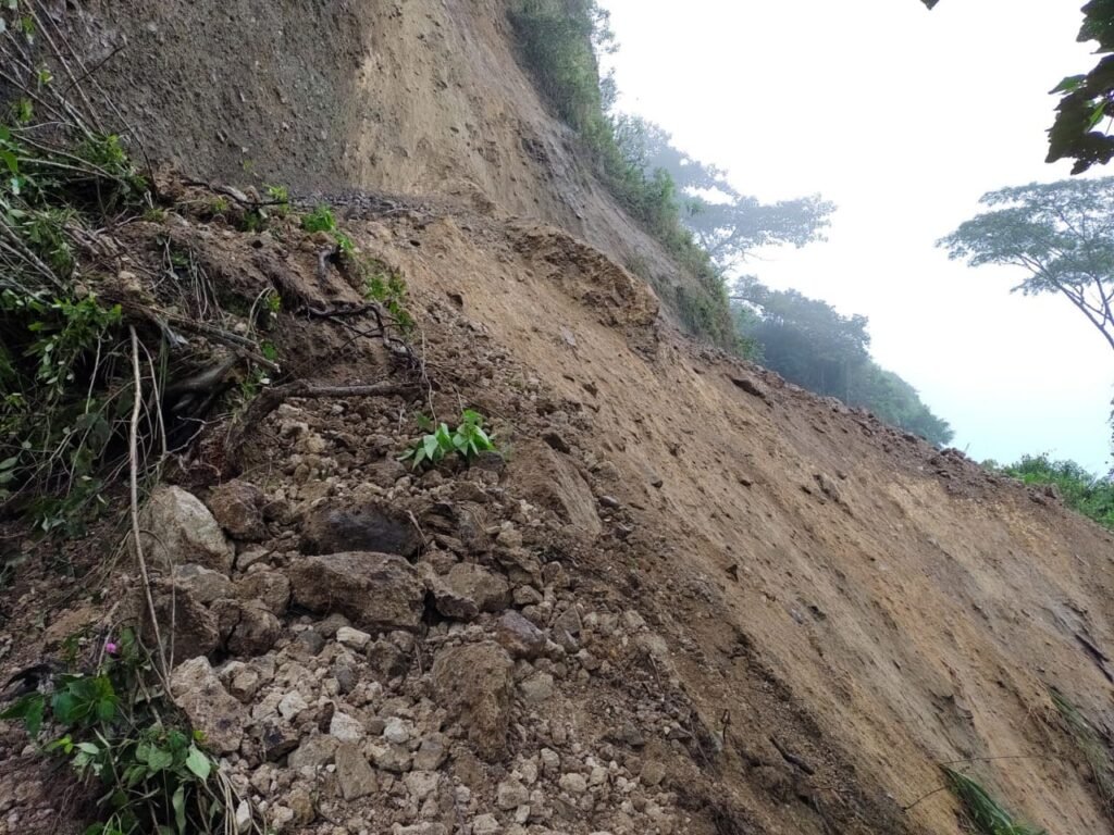 Dijo que en la curva, un poco más abajo de su casa se presentó un deslizamiento de una parte de la vía y unos 100 metros más arriba hay afectaciones de la vía.