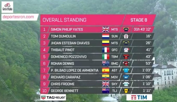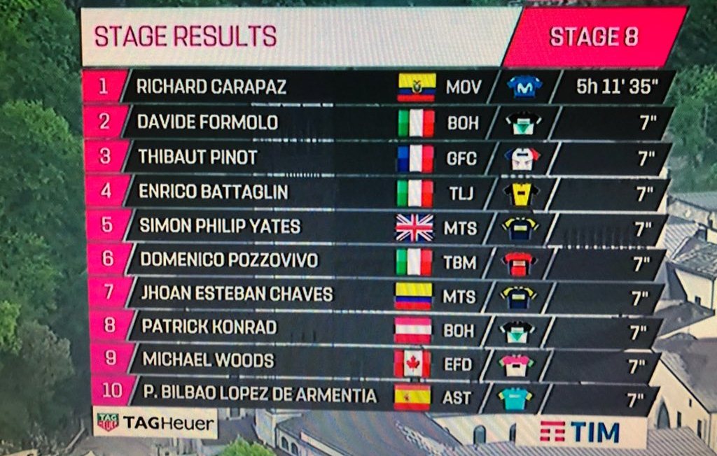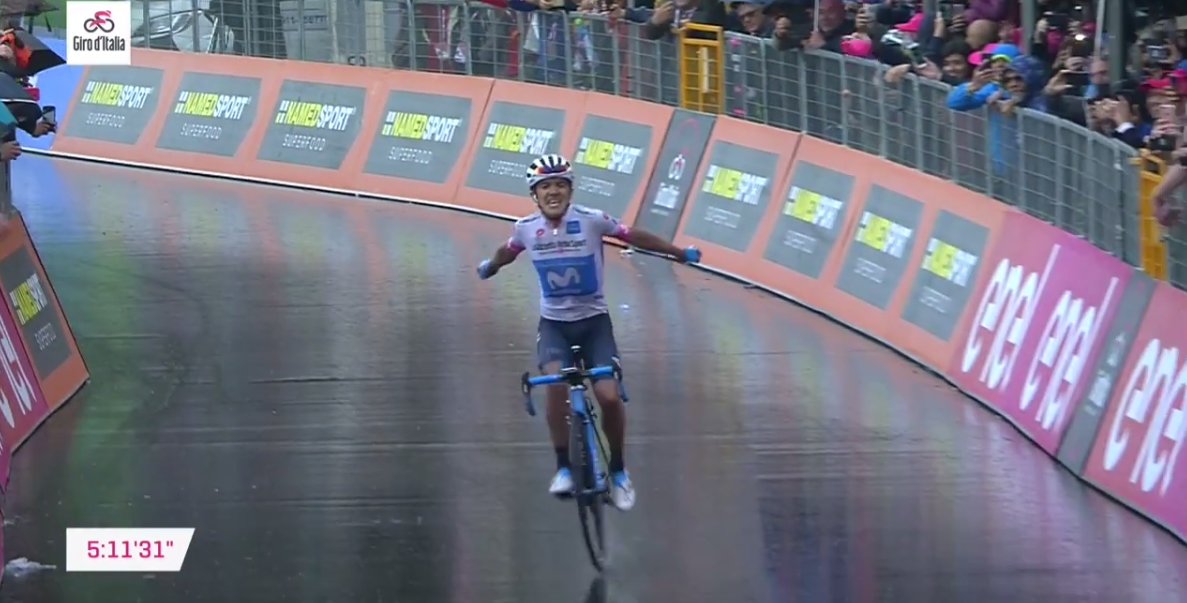 El ecuatoriano Richard Carapaz, del Movistar Team es el ganador de la etapa 8 del @giroditalia. Así se vivió la llegada a la meta por la pantalla de @SenalColombia. #GiroXSeñal pic.twitter.com/yhacNS1gju— RTVC Colombia (@RTVCco) 12 de mayo de 2018