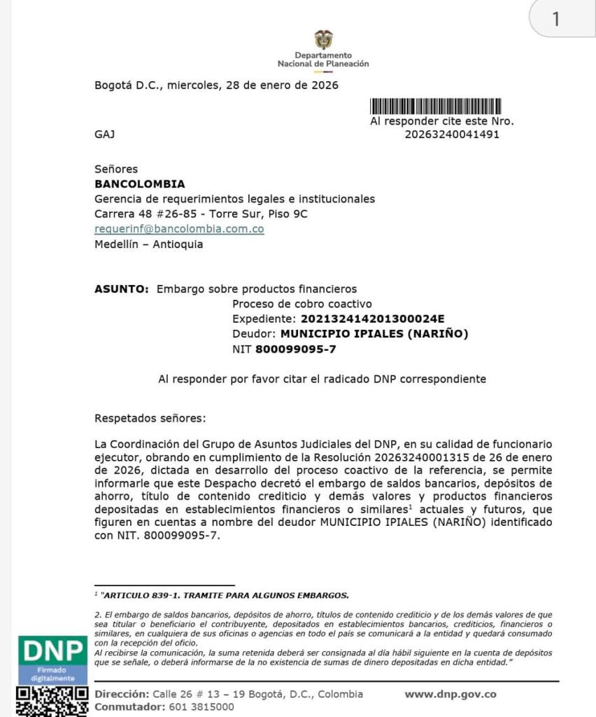 El Departamento Nacional de Planeación (DNP) ordenó el embargo de productos bancarios a nombre del Municipio de Ipiales (Nariño), dentro de un proceso de cobro coactivo, por un monto de hasta $8.000 millones. La medida afecta más de 50 cuentas oficiales y compromete recursos superiores a los $15.000 millones, lo que ha generado una grave afectación en la operatividad financiera del municipio.