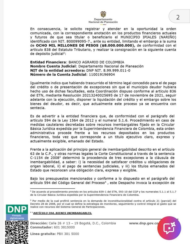 De acuerdo con el oficio expedido el 28 de enero de 2026 y dirigido a Bancolombia y otras entidades financieras, el DNP instruyó la retención de saldos bancarios, depósitos de ahorro, títulos de contenido crediticio y demás valores que figuren a nombre del municipio, identificado con NIT 800099095-7. Los recursos embargados deben ser consignados en una cuenta judicial del Banco Agrario, a nombre del Departamento Nacional de Planeación.