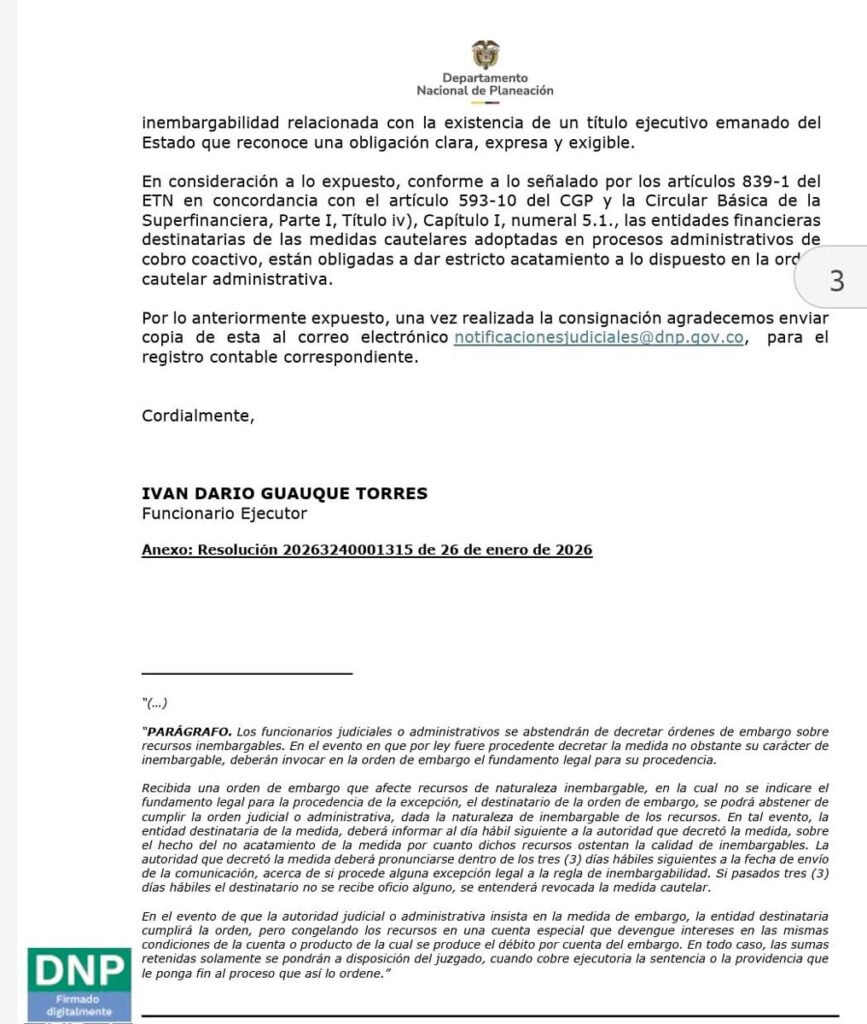 La decisión se adoptó tras el vencimiento del plazo legal para el pago de la obligación o la presentación de excepciones, lo que llevó a la ejecución plena de la medida cautelar y a la liquidación del crédito, en cumplimiento de la Resolución 20213240025695 de 2021. El DNP precisó que la deuda es plenamente exigible y recordó que solo ciertos recursos, como pagos laborales, sentencias judiciales y títulos estatales, pueden ser considerados inembargables.