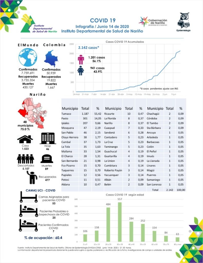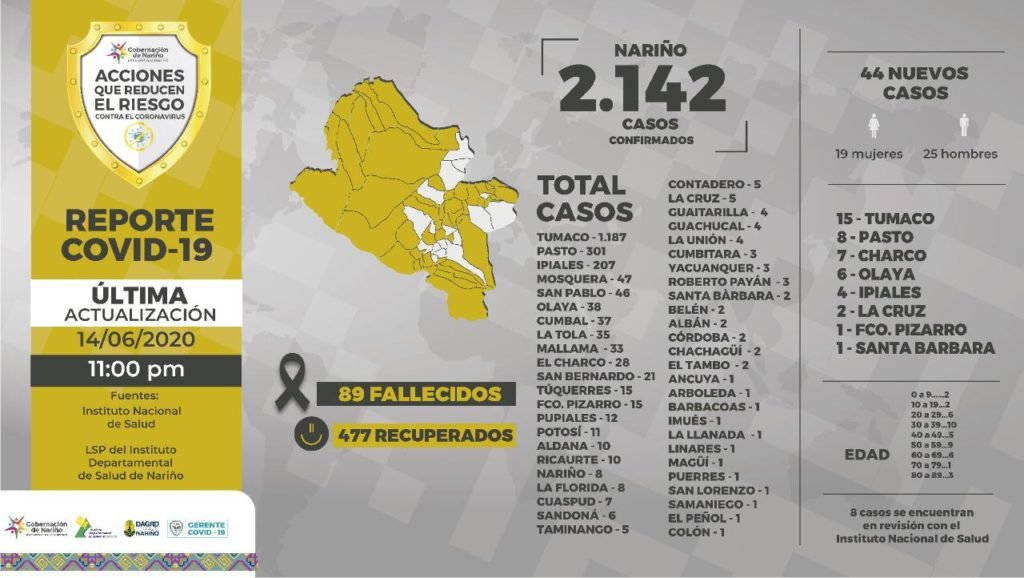 El 14 de junio de 2020, siendo las 9:34 pm en el Departamento de Nariño se totalizan 2.142 casos positivos para Covid-19. En revisión con el INS *8 casos.
