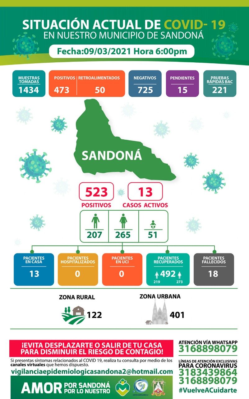 La Administración Municipal de Sandoná reportó este martes 13 casos activos de covid-19, con cuatro casos positivos y siete pacientes recuperados reportados en los últimos 11 días.