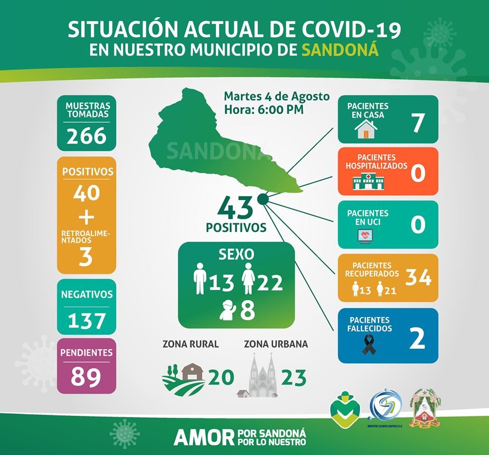 La Administración Municipal de Sandoná informó este martes en la tarde que en los últimos cuatro días en el territorio local se tomaron 15 muestras para covid-19, para un total de 266. Hasta la fecha 34 personas se han recuperado de la enfermedad.