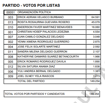 En segundo lugar, se ubicó la diputada Rosita Guevara Rosero, con 45.079 votos. Los cinco primeros lugares los completan Anderson Faver Martínez Benavides con 16.060 votos, Christian Hosep Palacios Ledezma con 4.554, y Juan Camilo González Delgado con 3.048 votos.