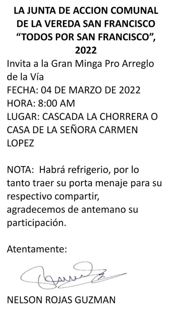 Rojas Guzmán invitó a la comunidad de la vereda San Francisco a participar en la minga que está prevista para este viernes para hacerle el mantenimiento a la vía entre La Chorrera y La Pielroja.