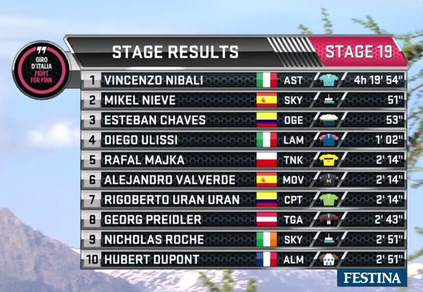 51 segundos y del colombiano Esteban Chaves a 53 segundos. Rigoberto Urán
