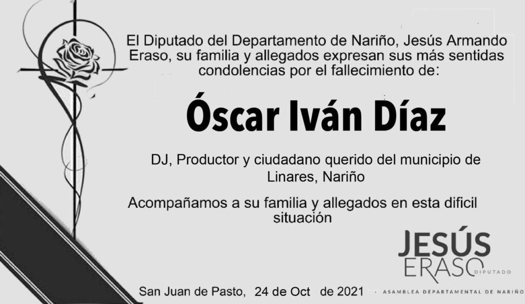 La alcaldesa de Linares Yasmín Hernandez Jurado en su cuenta de Facebook escribió: “Hoy nuestro Municipio se embarga de tristeza porque unos de sus talentosos hijos OSCAR IVÁN DÍAZ, que enorgullecía a los Linareños con su prodigiosa voz, ha partido de este mundo; extendemos nuestro abrazo sincero de solidaridad a su familia y amigos y elevamos nuestras oraciones a Dios para que los colme de fortaleza para afrontar esta lamentable partida.