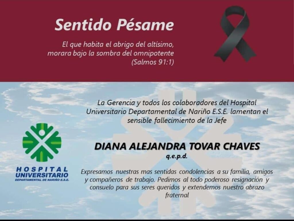 Los funcionarios del Hospital Universitario Departamental de Nariño lamentaron su fallecimiento y expresaron sus condolencias a sus familiares, amigos y compañeros de trabajo.