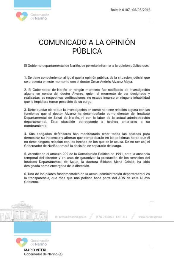 gobernador (E) de Nariño Mario Vitery Palacios expidió un comunicado en el cual fija la