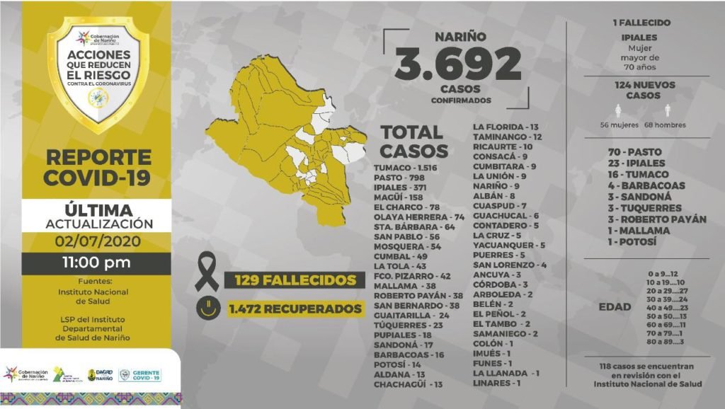 El 2 de julio de 2020, siendo las 10:00 pm en el Departamento de Nariño se totalizan 3.692 casos positivos para Covid-19. En revisión con el INS *118 casos.