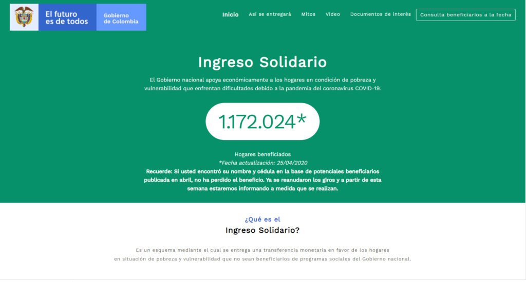 Según esta página mediante el Ingreso Solidario el Gobierno nacional apoya económicamente a los hogares en condición de pobreza y vulnerabilidad que enfrentan dificultades debido a la pandemia del coronavirus COVID-19.