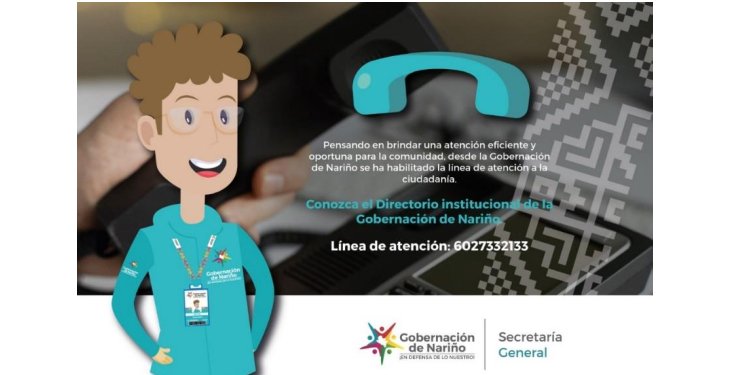 Finalmente, se reitera el llamado a la comunidad para comunicarse a la línea telefónica 6027332133 donde podrán resolver sus solicitudes e inquietudes. Trabajamos de manera incluyente, conectada, segura, competitiva y sostenible por nuestra gente y el desarrollo de Mi Nariño.