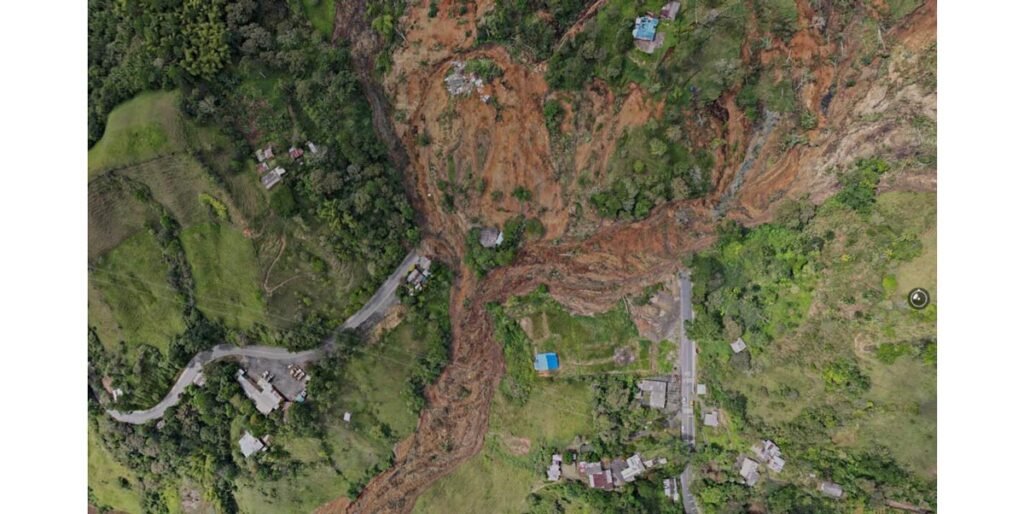 El señor Christian Viveros, en su cuenta de Facebook, compartió una foto de 360 grados sobre la magnitud de la zona afectada por el movimiento en masa en el municipio de Rosas, departamento del Cauca.