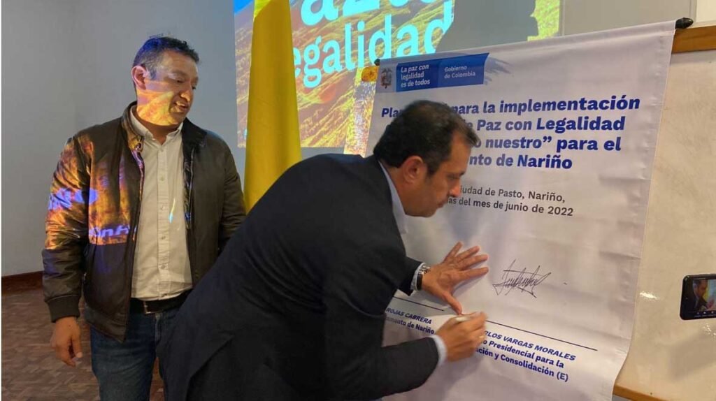 Se firmó en el departamento de Nariño el Plan Integral para la implementación de la Política Paz con Legalidad como la carta de navegación interinstitucional para la sustitución voluntaria entre la comunidad y los gobiernos departamental y nacional, logrando apoyar iniciativas productivas en Buesaco, La Cruz, Tablón de Gómez, Samaniego y tres nuevas iniciativas para cordillera y el pacífico.