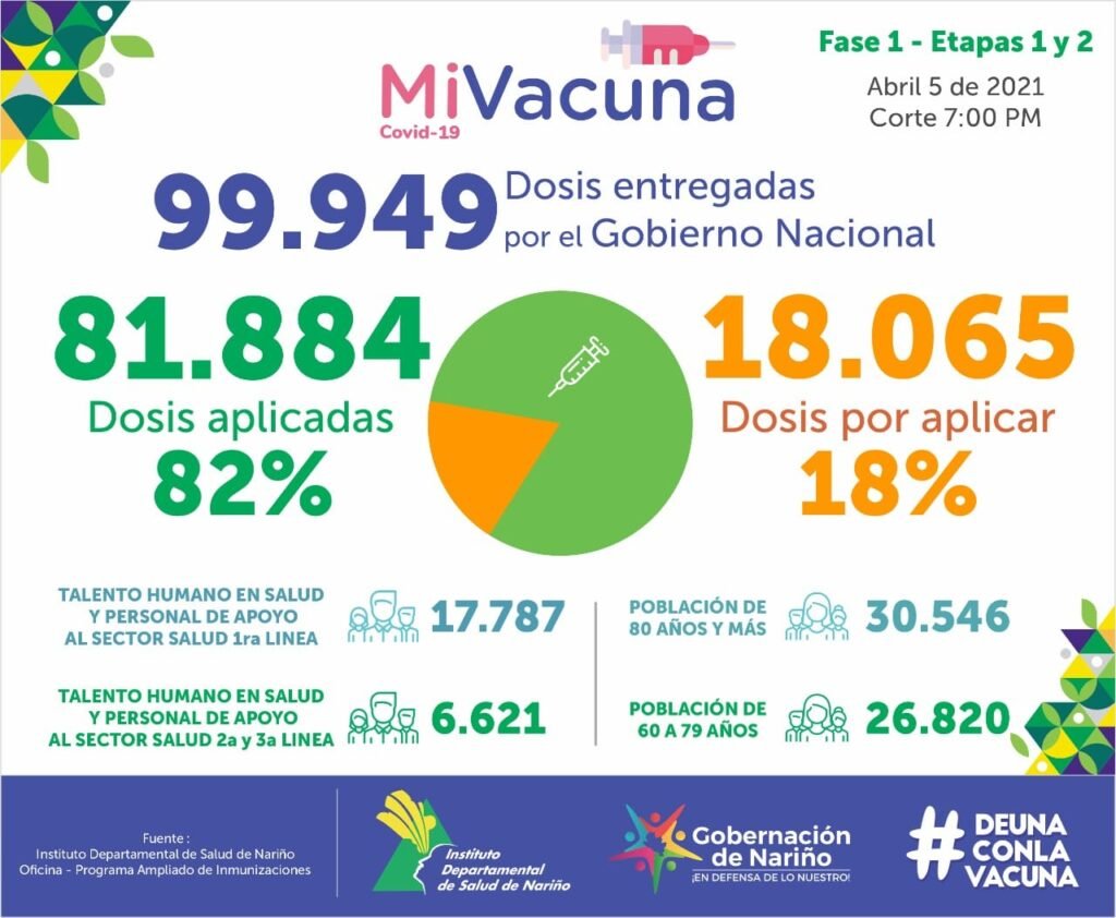En la actualidad, Nariño se encuentra en un 82% de aplicación de vacunas (corte 5 abril 7 pm), luego de su entrega en el Centro de Acopio, desde donde su coordinadora solicitó a todos los prestadores, tanto del sector público como privado, en Pasto y el resto de municipios, atender los lineamientos del Ministerio de Salud y del IDSN para que se garantice el acceso a la vacunación y se fortalezcan las estrategias institucionales y los equipos de vacunadores en las regiones.