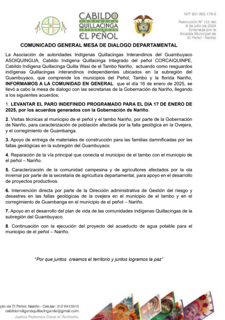 Como parte de su política de puertas abiertas y diálogo permanente con las comunidades, la Gobernación de Nariño, a través de las secretarías de Planeación, Infraestructura y Agricultura, la Dirección Administrativa de Gestión del Riesgo de Desastres, la Subsecretaria de Desarrollo Comunitario y el Plan Departamental de Aguas, llegó a acuerdos con la Mesa de Diálogo Departamental, integrada por la Asociación de Autoridades Indígenas Quillacingas Interandinos del Guambuyaco y los Cabildos Indígenas Quillacingas de El Peñol, El Tambo y La Florida.