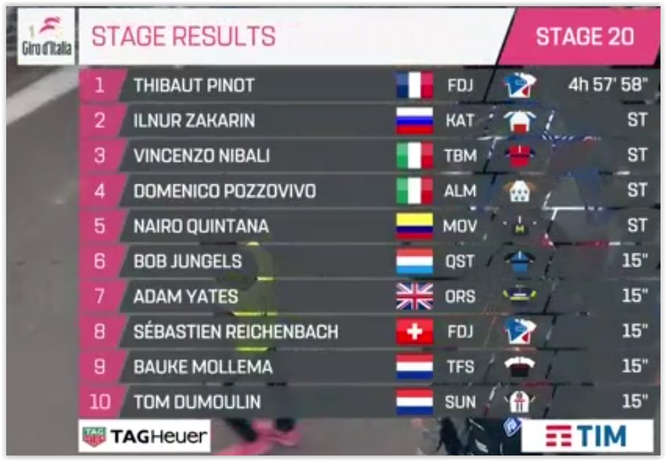 aventaja a Vicenzo Nibali por 39 segundos, a Thibaut Pinot por 43 segundos, a