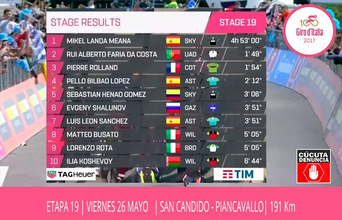 nacido en Cómbita, Boyacá, ahora lidera la carrera italiana, con un tiempo acumulado de 85 horas
