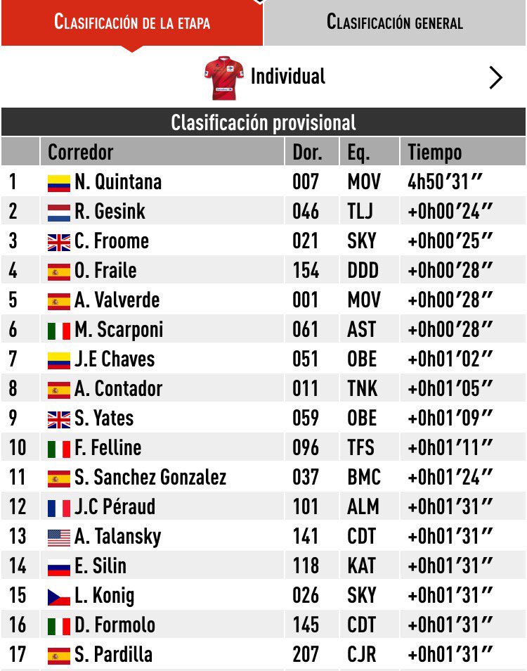 segundos, Froome a 25 segundos y luego arribaron Fraile, Valverde y Scarponi a