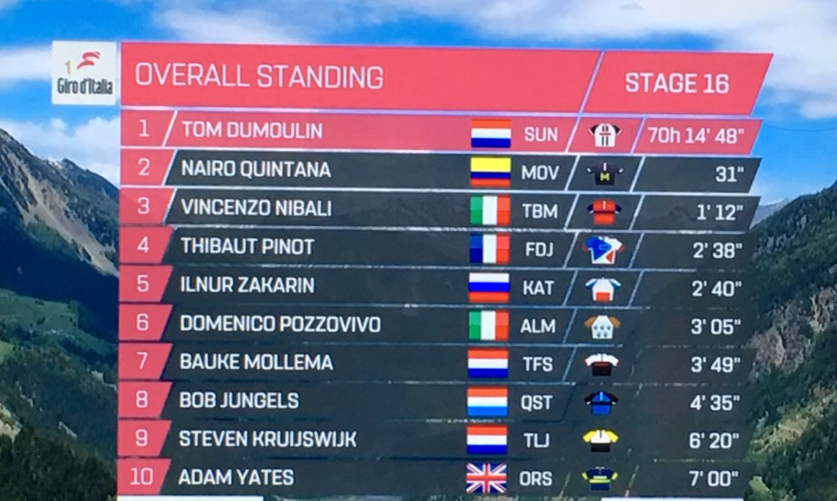 colombiano Nairo Quintana quedó a 31 segundos del líder del Giro de Italia Tom Dumoulin,