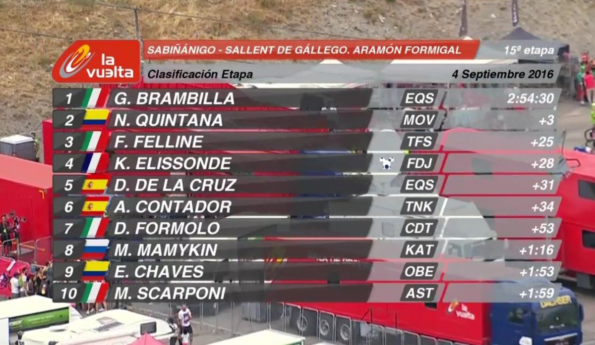 En la general Nairo aventaja a Froome por 3 minutos 37 segundos, a Chaves por 3 minutos 57 segundos y a Contador por 4 minutos 2 segundos.