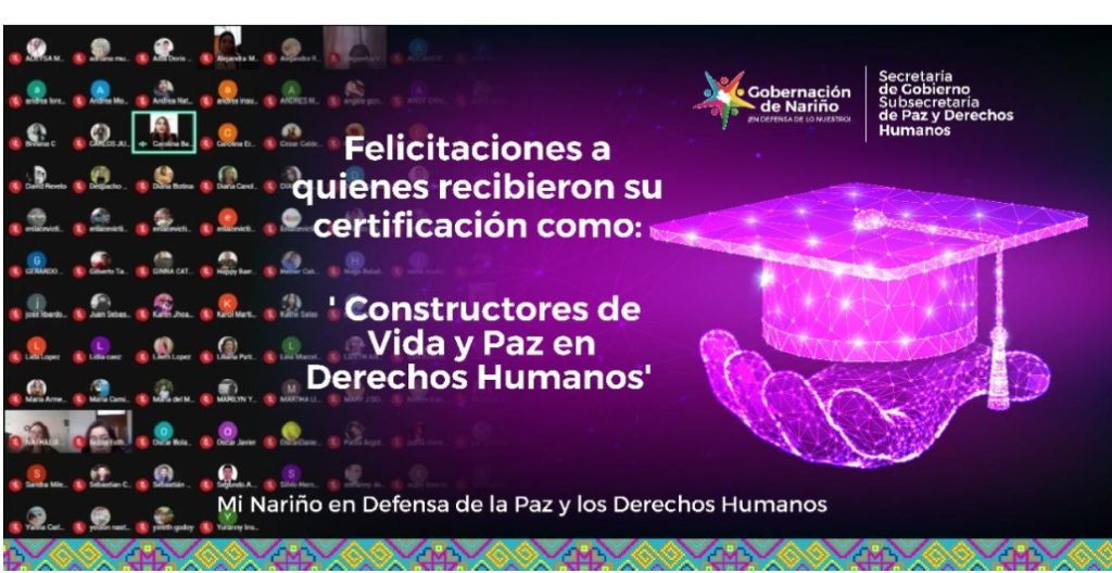 A través de una ceremonia de graduación virtual, un total de 210 hombres y mujeres, procedentes de 50 municipios de Nariño y de los departamentos de Chocó y Cundinamarca, recibieron por parte de la Gobernación de Nariño la certificación que los acredita como ‘Constructores de vida y paz en Derechos Humanos’.