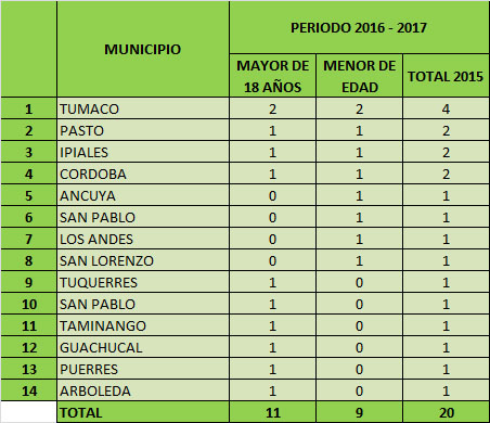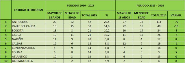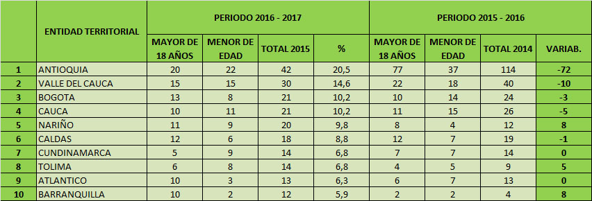 Bogotá con 21, Cauca con 21 y Nariño con 20.
