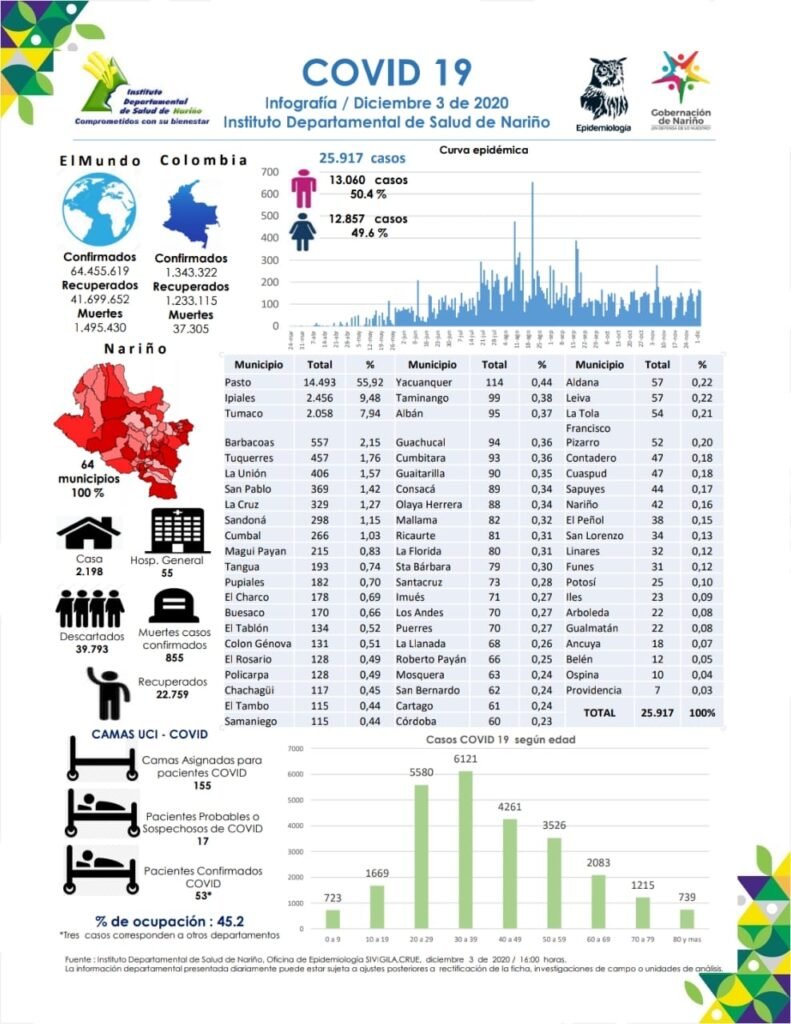 El 3 de diciembre de 2020, siendo las 4:00 pm en el Departamento de Nariño se totalizan 25.917 casos positivos para Covid-19.