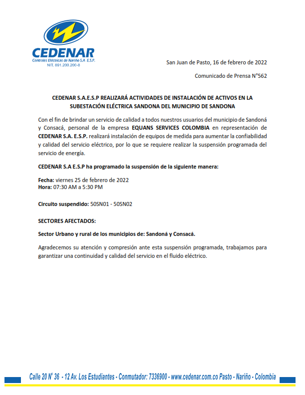 El comunicado señala que: “Con el fin de brindar un servicio de calidad a todos nuestros usuarios del municipio de Sandoná y Consacá, personal de la empresa EQUANS SERVICES COLOMBIA en representación de CEDENAR S.A. E.S.P. realizará instalación de equipos de medida para aumentar la confiabilidad y calidad del servicio eléctrico, por lo que se requiere realizar la suspensión programada del servicio de energía.”