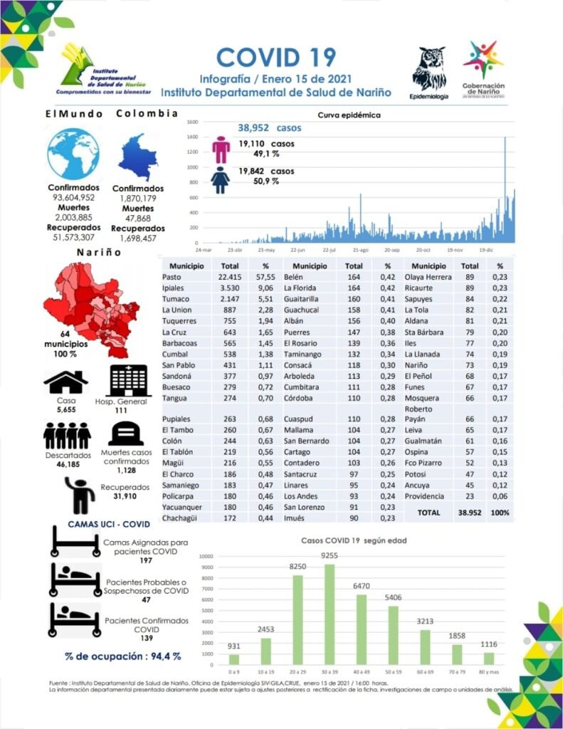 El 15 de enero de 2021, siendo las 4:00 pm en el Departamento de Nariño se totalizan 38.952 casos positivos para Covid-19. Se totalizan 1.128 muertes desde el comienzo de la Pandemia en Nariño.