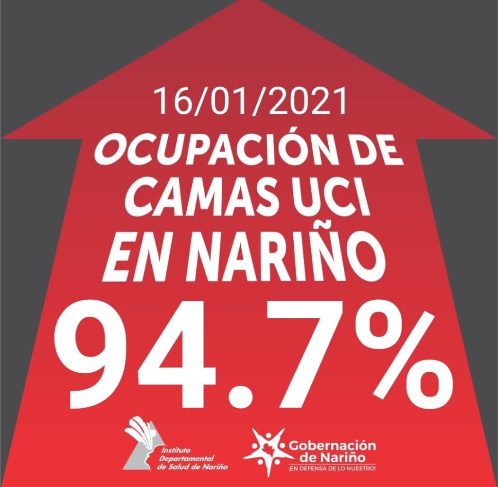 El Instituto Departamental de Salud de Nariño reportó este sábado que de las 206 camas UCI asignadas, 52 están ocupadas por pacientes probables o sospechosos de covid y 143 por pacientes confirmados de covid, para un 94.7 por ciento de ocupación.