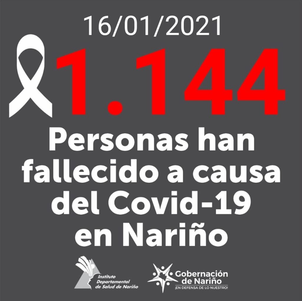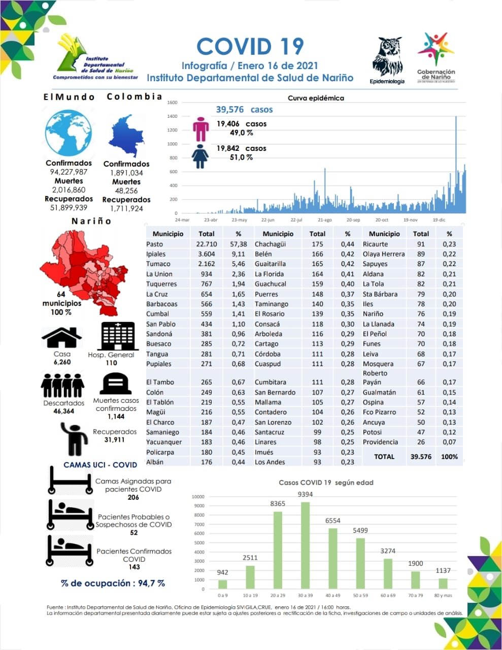 El 16 de enero de 2021, siendo las 4:00 pm en el Departamento de Nariño se totalizan 39.576 casos positivos para Covid-19. Se totalizan 1.144 muertes desde el comienzo de la Pandemia en Nariño.
