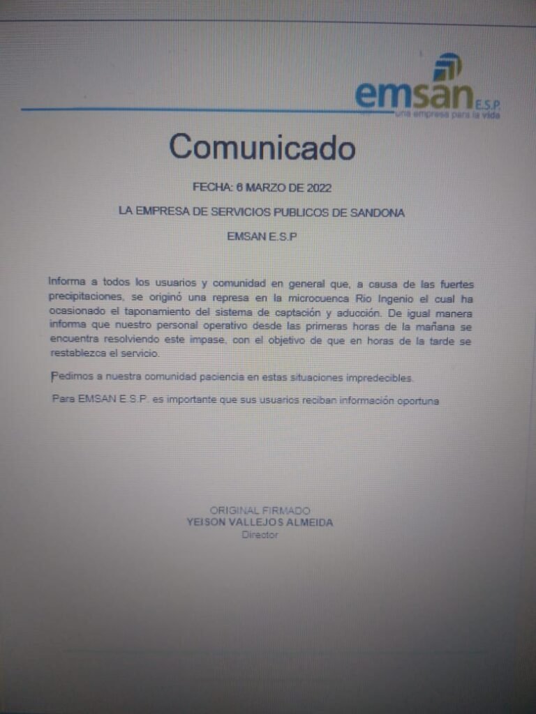 Seis operarios de la empresa de servicios públicos de Sandoná – Emsan continuarán los trabajos en la bocatoma del acueducto municipal durante este domingo con el fin de restablecer el servicio de agua.