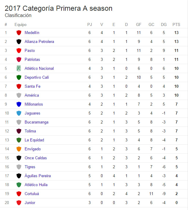 Cumplidas 6 jornadas y teniendo en cuenta que hay algunos partidos aplazados, la tabla de posiciones es la siguiente: