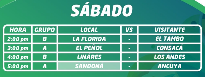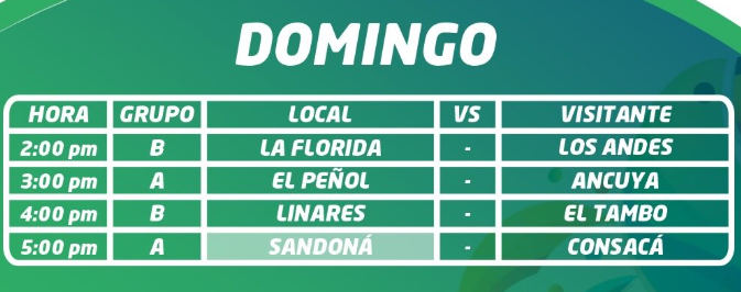 Linares 4 La Florida 1; Consacá 8 Ancuya 4; Los Andes 3 El Tambo 1; Sandoná 6 El Peñol 3.